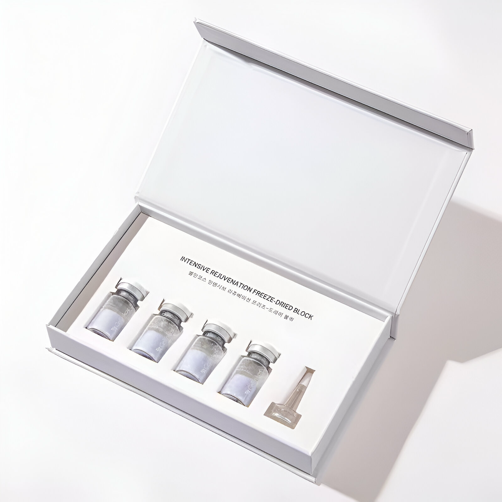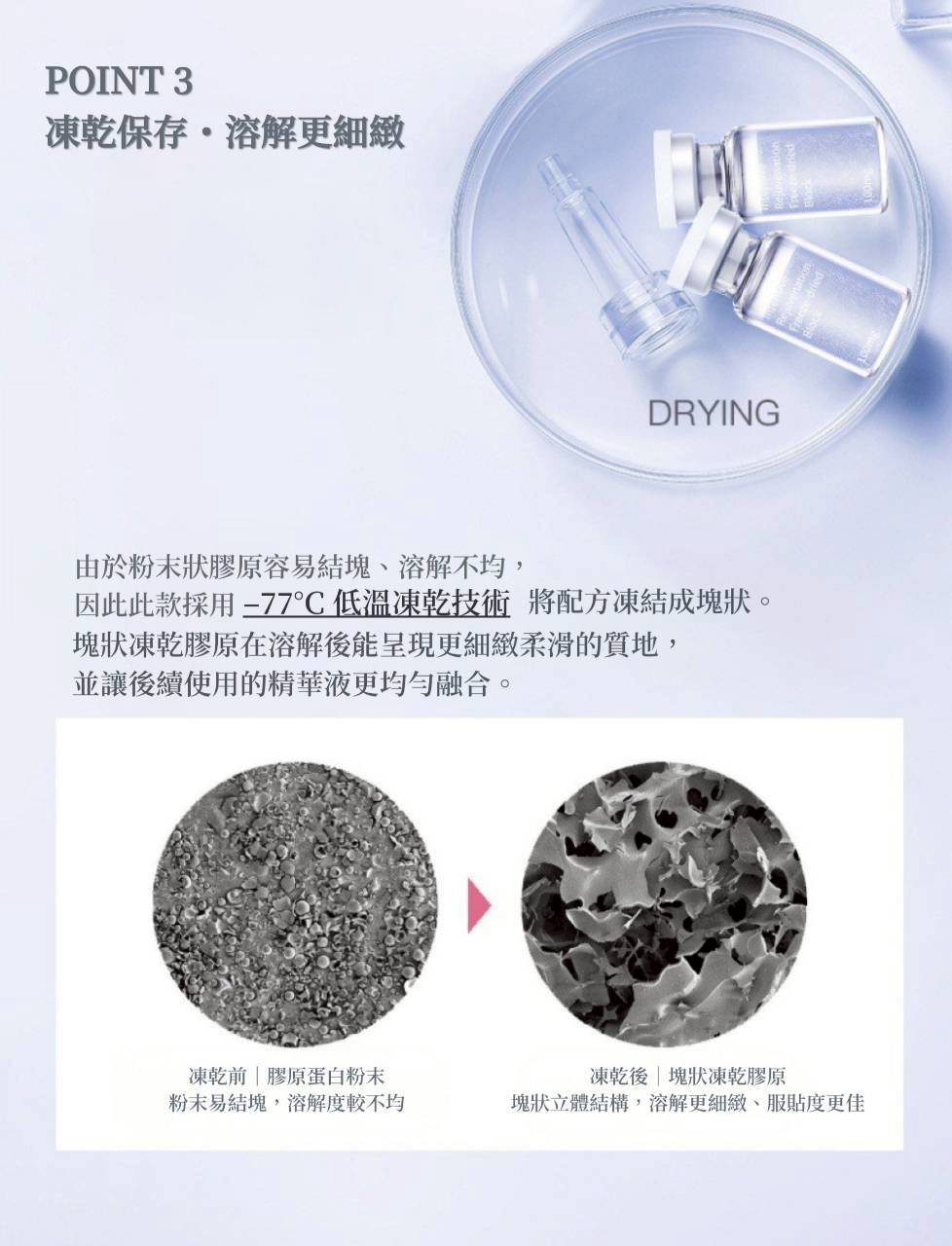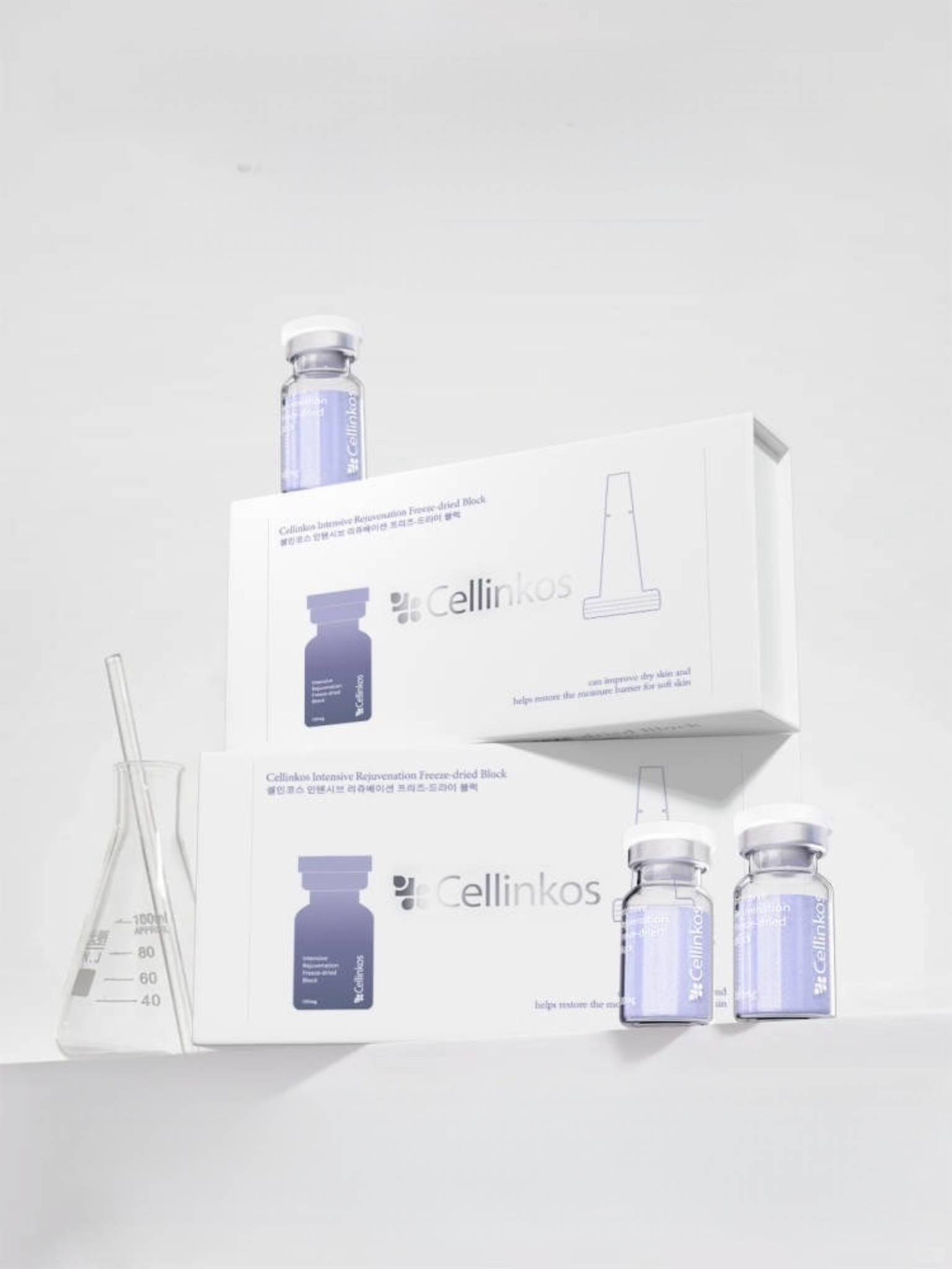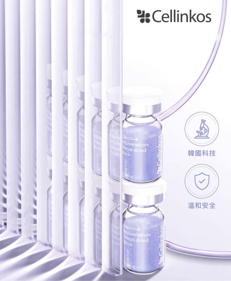 Cellinkos 高濃度凍乾修護安瓶,採用冷凍乾燥技術,將多重保養成分完整封存,於使用時活化釋放。搭配高濃度玻尿酸與多種舒緩、潤澤成分,質地清爽好吸收,適合肌膚乾燥、疲憊或需要加強保養時使用,幫助肌膚維持水潤彈嫩與穩定狀態,展現細緻透亮光澤